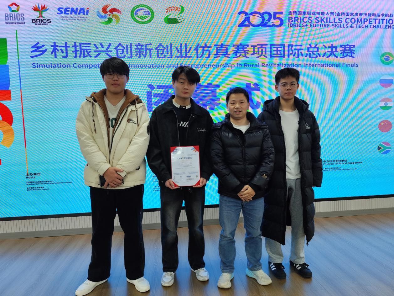 11月16日,2025年金砖国家职业技能大赛(乡村振兴创新创业仿真赛项)国际总决赛在鄂尔多斯生态环境职业学院圆满落幕。由我校援疆教师徐群刚指导的双河职业技术学院现代农业技术专业2024级学生李璐毅、楚定权、张浩冉,凭借扎实的专业功底和出色的现场发挥,在激烈竞争中脱颖而出,荣获大赛三等奖。这一成绩不仅实现了双河职业技术学院在该项赛事中“从无到有”的历史性突破,也创下了该校的首个奖项纪录,是我校全力支援新疆职业教育发展、深化教育援疆工作取得的又一重要成果。