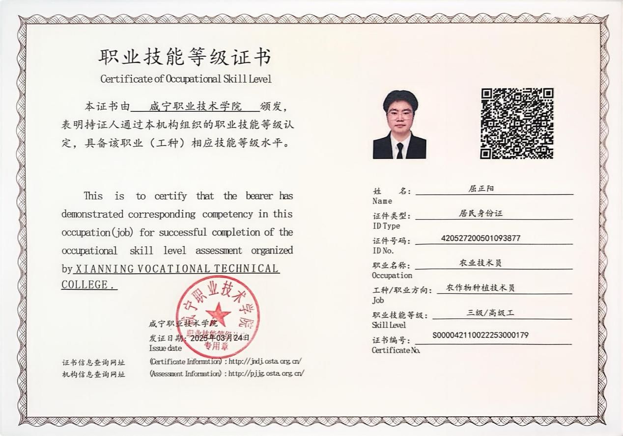 图1:屈正阳同学考取农作物种植技术员等技能证书(三级/高级工)