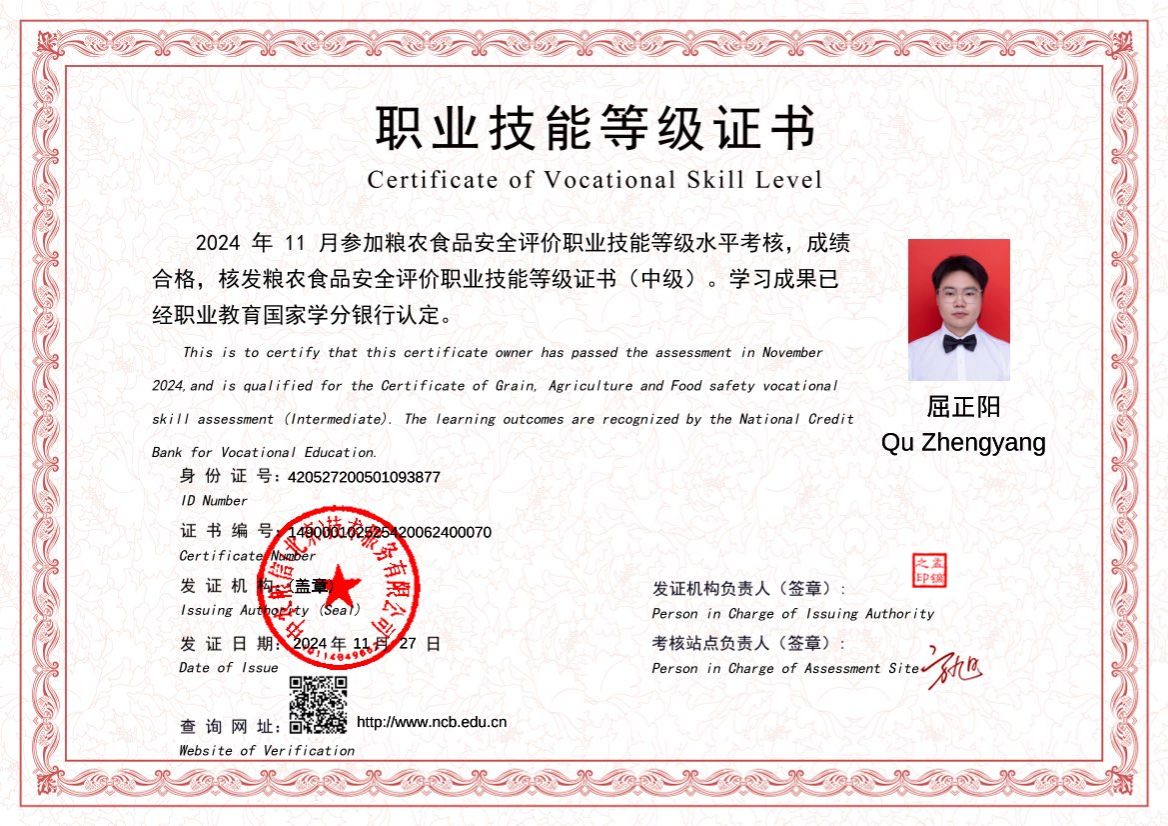 图2:屈正阳同学考取粮农食品安全评价职业技等技能证书(四级/中级工)