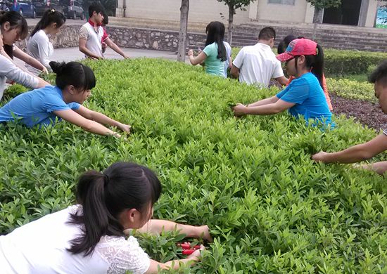 本次实训是基于真实生产场景、真实生产任务驱动、真实工作过程导向的生产性实训。实训由蒋家和、冯律君、李名钢、阮长海等老师指导, 12园艺班、13园艺班分别要完成红花檵木、毛杜鹃、红叶石楠(共约40000株)1畦地苗木的扦插繁殖任务。实训过程中,老师和同学都发挥不怕苦不怕累的精神,风雨无阻,参与插床整理、荫棚搭建、插条的采集、插穗的制作、扦插、浇水、覆膜、插后管理等生产流程,保质保量的完成各个环节。