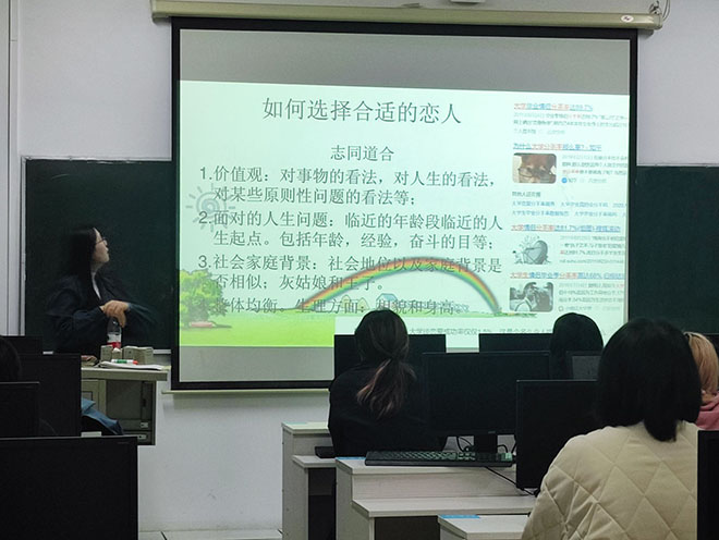 为培养学生们树立正确的恋爱观,建立良好的人际交往关系,更好地处理学习与恋爱的关系,10月15日晚,我院开展了“大学生恋爱观”主题班会。新生辅导员罗净净、徐群刚、吴珂作分享,全体新生参加。 罗净净分享正确的...